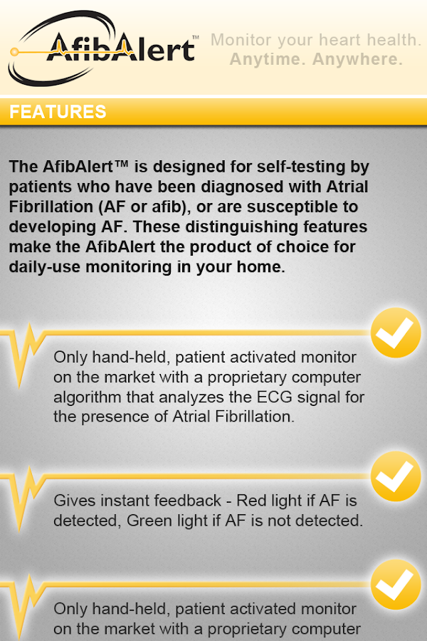 AfibAlert atrial fibrillation monitor. The monitor uses a proprietary com-puter algorithm to detect the presence of atrial fibrillation. In order to monitor their heart rhythms, the patient places their thumbs on raised pads on either side ... Read Document